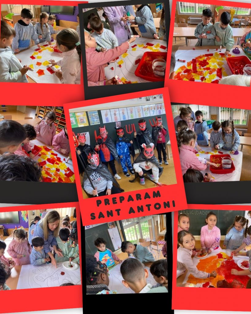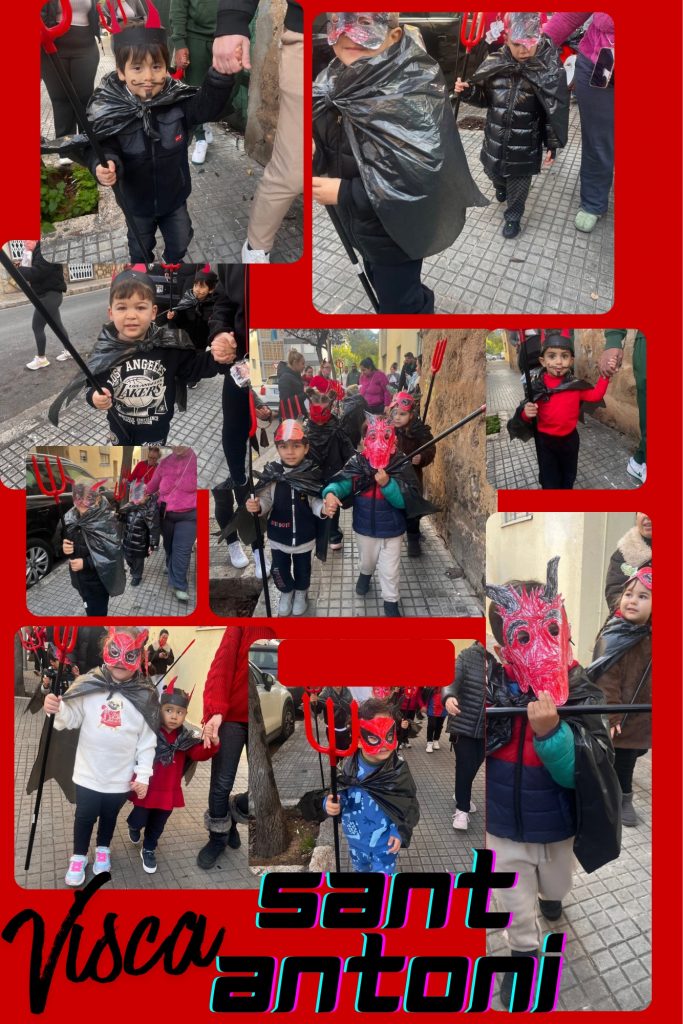 DIMECRES PASSAT VÀREM CELEBRAR SANT ANTONI. ENS VÀREM VESTIR DE DIMONIS, VÀREM ANAR A LA PLAÇA DE L’ESGLÈSIA ON DOS DIMONIS ENS VAREN DONAR UN SUSTO, ALLÀ VÀREM CANTAR I BALLAR. DESPRÉS QUAN VAM TORNAR A L’ESCOLA VÀREM BERENAR DE TORRADA.